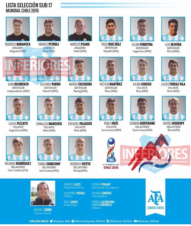 Ante la confirmación de los 21 futbolistas que representarán a la Argentina en el Mundial Sub 17 Chile 2015, dicha selección dirigida por Miguel Ángel Lemme comenzó sus trabajos finales de preparación, pensando en su debut del próximo domingo 18 del corriente mes ante el seleccionado mexicano, desde las 19 horas.
